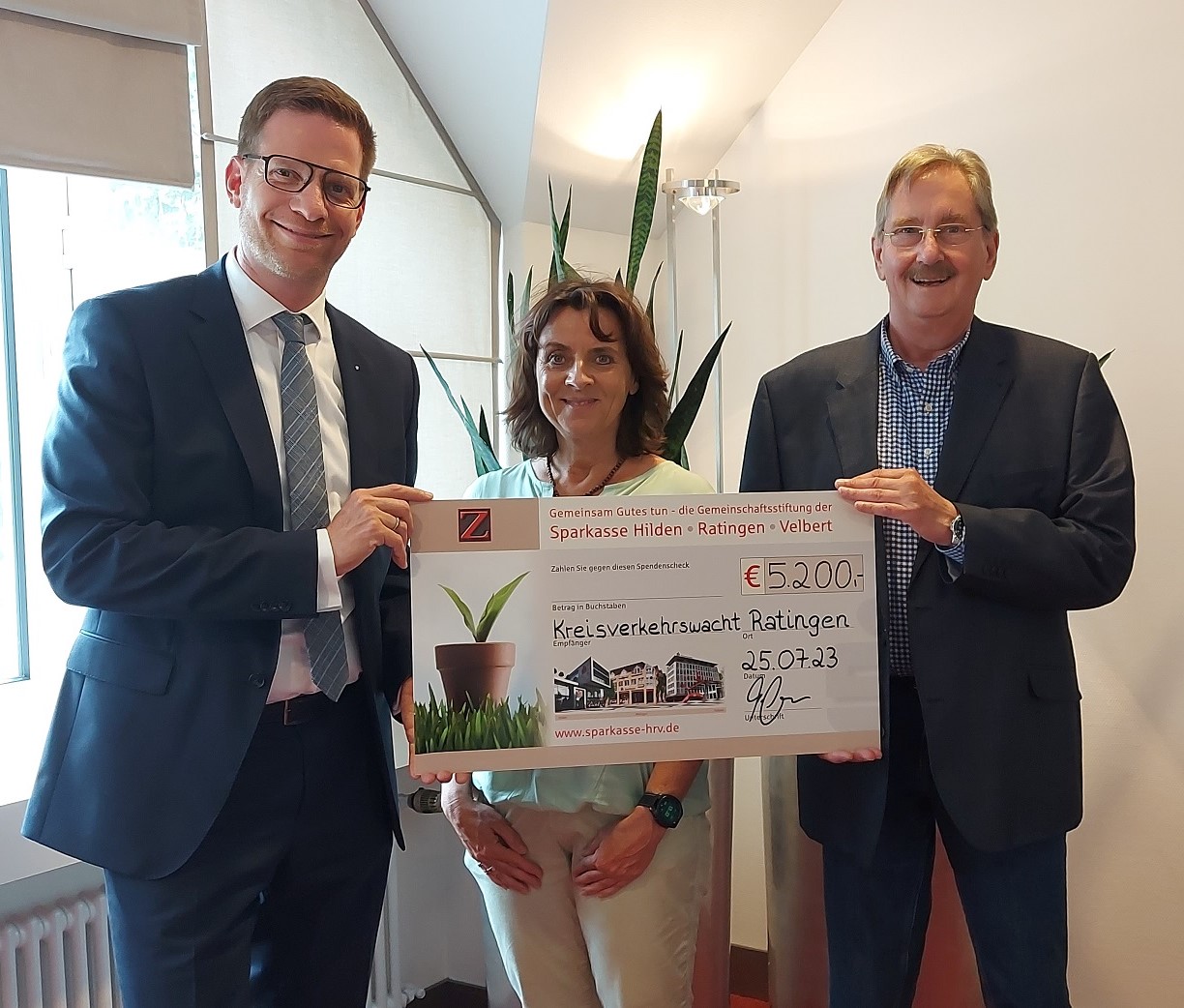 Die Gemeinschaftsstiftung der Sparkasse Hilden, Ratingen, Velbert, vertreten durch Herrn Matthias Gotschika, Direktor Private Banking der Sparkasse HRV, überreichte am 25. Juli 2023 einen Scheck in Höhe von 5.200,– Euro an die Kreisverkehrswacht Mettmann e. V., vertreten durch die Projektleiterin Tanja Smigoc und den Geschäftsführer Uwe Zimmermann.