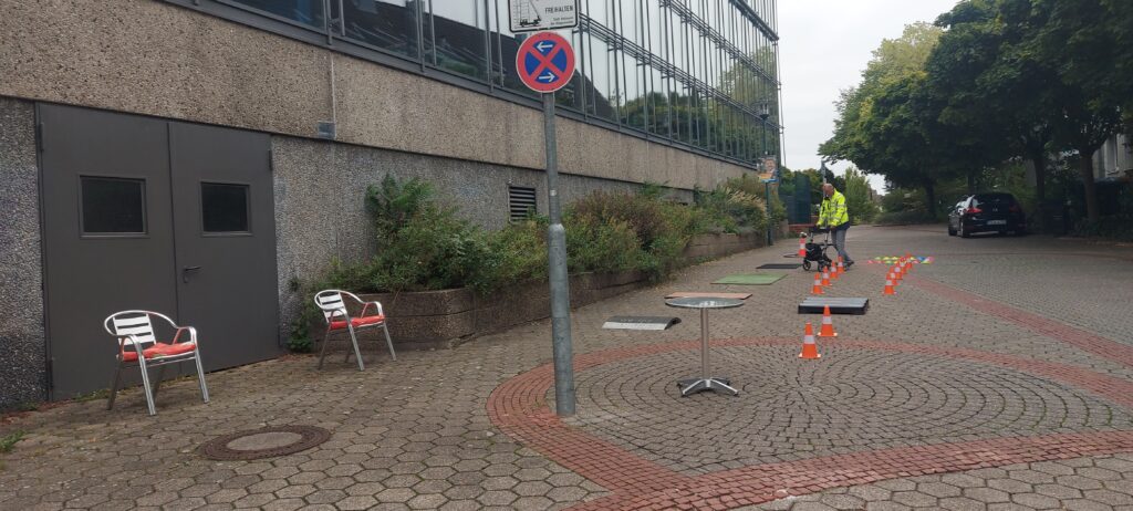 Danach ging es in die Praxis. Auf einem speziell aufgebauten Parcours wurden die richtige Körperhaltung, das sichere Hinsetzen und Aufstehen, das Überwinden von Hindernissen, das Absteigen vom Bordstein und das Fahren in Kurven trainiert. Mit viel Übung und gegenseitiger Unterstützung meisterten alle Teilnehmerinnen und Teilnehmer die Stationen mit Bravour.